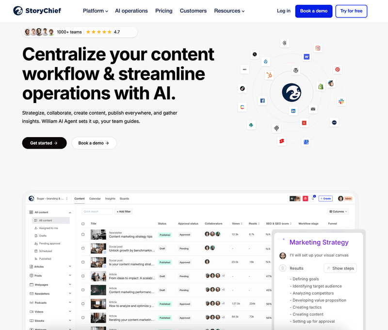StoryChief is an all-in-one content marketing platform. It brings strategy, creation, collaboration, SEO guidance, scheduling, publishing, and performance tracking into one workflow.
