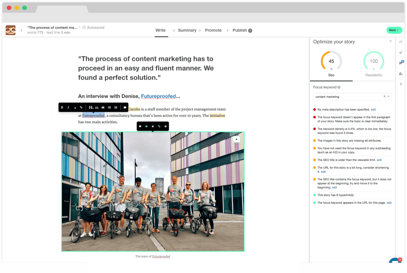 Are the sentences too long? Did you use passive voice and are there transition words present? The Readability section helps you to structure your story better for humans and double the average read time.
